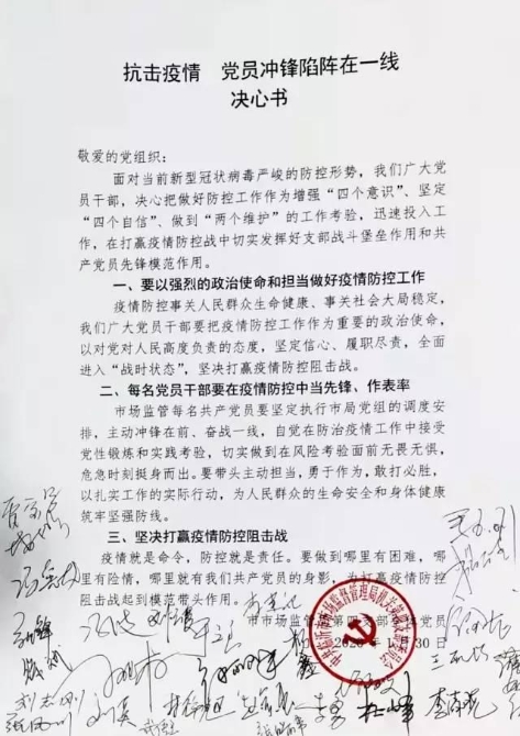 面对疫情,山东省临沂市市场监督管理局向全体党员发出抗击疫情党员冲锋陷阵在一线号召,机关各支部积极响应,组织支部党员在决心书上签字,一致表态要以强烈的政治使命和责任担当主动做好疫情防控工作,在疫情防控阻击战中,冲锋在前、奋战一线,当先锋、作表率,坚定执行市局党组的调度安排,自觉在防治疫情工作中接受党性锻炼和实践考验,做到在风险考验面前无畏无惧,危急时刻挺身而出,以扎实工作的实际行动,发挥好支部战斗堡垒作用和共产党员先锋模范作用,为人民群众的生命安全和身体健康筑牢坚强防线。