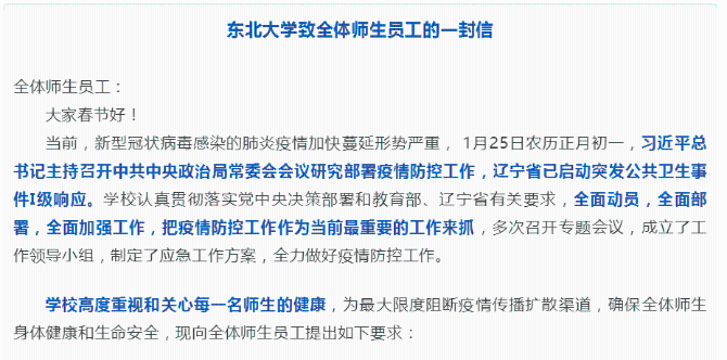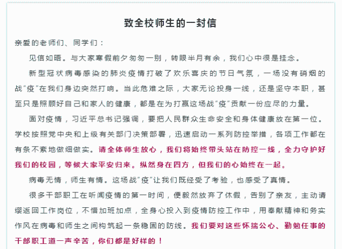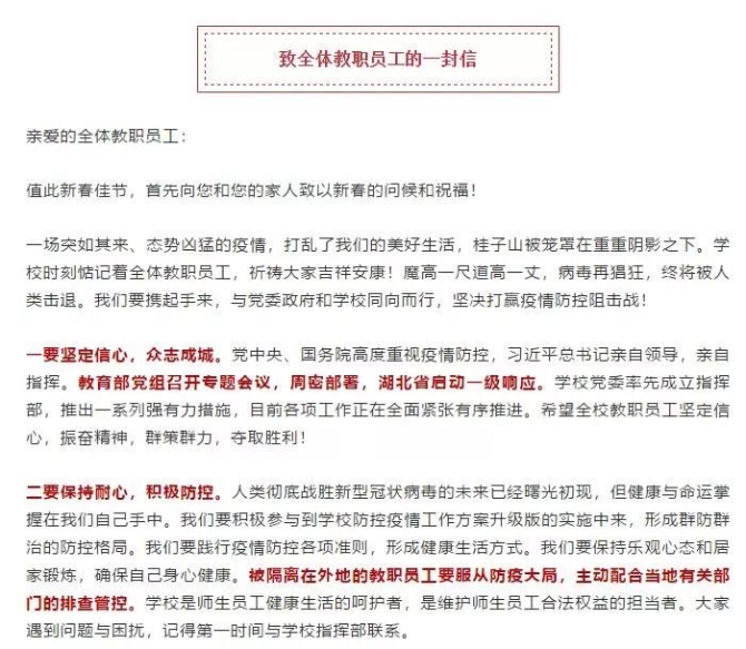 四方一心、同舟共济。身在四方的理工大人是学校每时每刻的牵挂。你们的健康,就是我们最大的期盼;你们的平安,就是我们最大的心愿。身在四方的你们也一定牵挂着学校的安危,记挂着每位理工大人的健康。疫情就是命令、防控就是责任。请大家放心,坚守岗位的每一位理工大人将认真履职尽责,努力做好学校防控疫情各项工作。