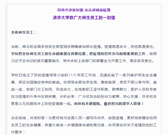 学校已成立了防控疫情领导小组和11个专项工作组,迅速实施了一系列维护师生安全健康、保证校园稳定有序的措施。校领导全部在京在岗、靠前指挥,党员干部以身作则、奋战一线,各部门分工协同、形成合力,在岗教职工坚守职责、群策群力,医护人员和专家在与疫情的斗争中忘我拼搏、分秒必争,广大校友也纷纷出力献策、热心支援,许多校友更是义无反顾地冲上防控疫情第一线。向所有不避艰险、奋进担当的清华人致敬!