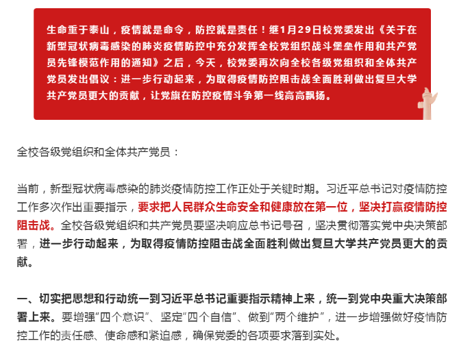 以防疫斗争前线的复旦大学优秀医务工作者和先进基层党组织为榜样,充分发挥广大党员的先锋模范和基层党组织的战斗堡垒作用。要发挥学校党委、二级党组织和基层党支部“三线联动”工作优势,凸显党组织的政治核心作用,通过设立党员责任区、组建党员突击队等,广泛动员群众、组织群众、凝聚群众,坚定信心、同舟共济、科学防控、精准施策,为打赢防控阻击战提供坚强政治保证和组织保证。