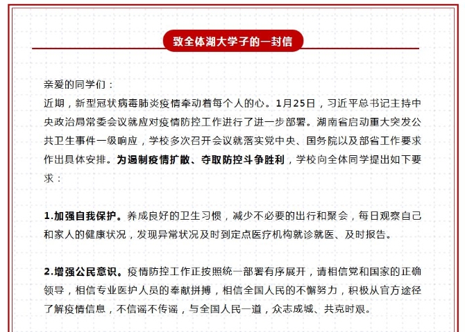 行动听从指挥。为保障广大师生的健康和安全,学校实行严格进出校园管理制度,暂停开放图书馆、教学楼、体育馆、岳麓书院等公共场馆。请全体同学暂停社会实践活动,不要提前返校,返校时间学校将及时另行通知。学校将实时统计同学们的假期行程和身体状况,并按要求实施报告制度,请大家认真对待,如实反馈。