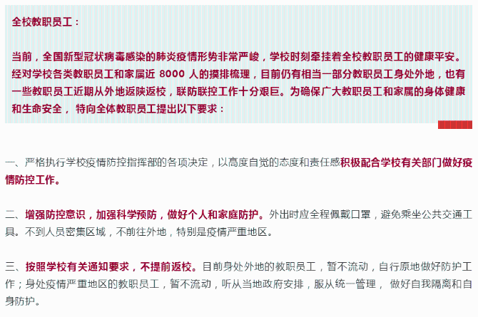 按照学校有关通知要求,不提前返校。目前身处外地的教职员工,暂不流动,自行原地做好防护工作;身处疫情严重地区的教职员工,暂不流动,听从当地政府安排,服从统一管理, 做好自我隔离和自身防护。