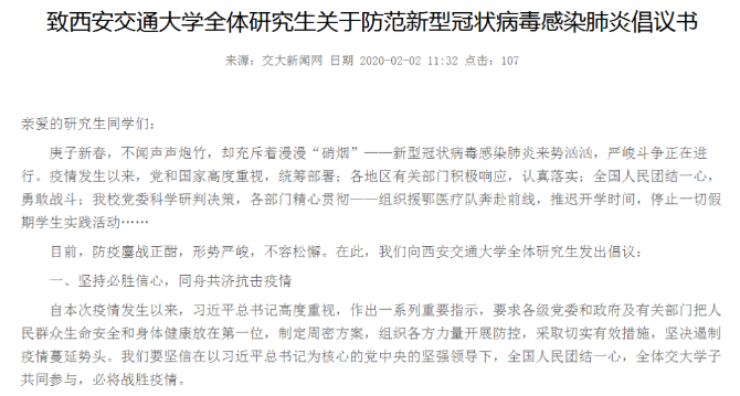 《致西安交通大学全体研究生关于防范新型冠状病毒感染肺炎倡议书》(节选)