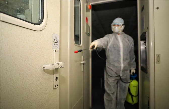 被防护服包裹的卿召秀正在对车厢内的坐席喷洒消毒液。她从早晨9时工作到中午13时,已经连续工作了4小时,护目镜上早已蒙上了一层雾气,防护服里大汗淋漓,防护服上滴的都是消毒水。她说:“我们对车体内只要是手能碰触到的地方都要重点消毒,尤其是洗漱间和卫生间。虽然工作环境艰苦,但大家都干劲十足。”