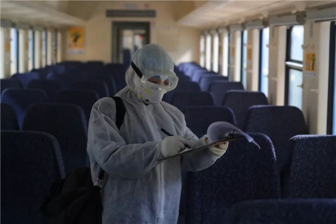 抗击疫情以来,中国铁路乌鲁木齐局集团有限公司疾控中心消杀科站车消杀队始终战斗在第一线。他们对每天入库的客车车体进行全面的消毒,工作量之大以至于他们每天中午吃饭的时间只有20分钟。