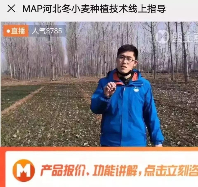 中化农业MAP粮作河北省区Mapper通过田间现场直播方式,探查苗情,为种植户解疑答惑。一个小时的直播,收视高峰达到了4千多人观看 。农户通过直播间留言了解小麦苗情、用肥、用药及管理知识,由Mapper农艺师担任的主播一一解答,为农户进行线上技术指导。