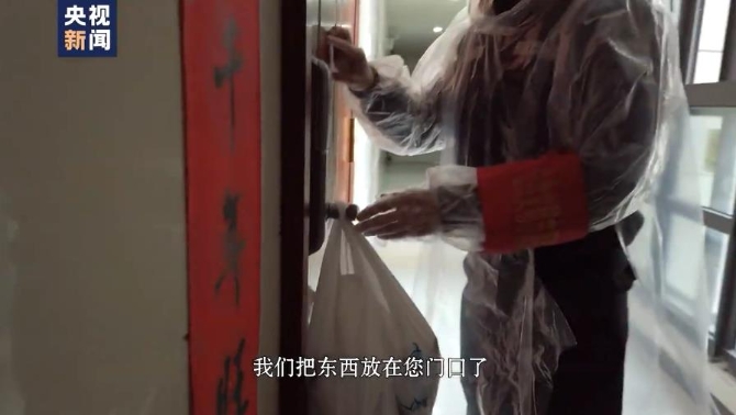为了进一步保护居民,他们选择把代买的生活用品放在门口,待他们走后由居民自取的方式,减少居民的风险。