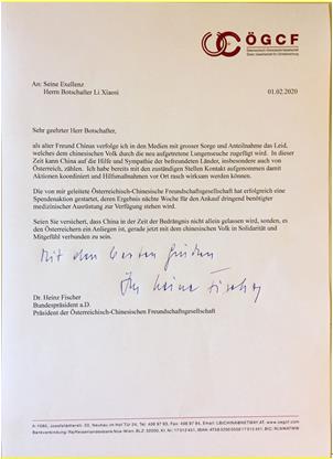 奥地利前总统、奥中友协主席菲舍尔表示,“我们深信,只要各方团结一致,共同努力,就一定能尽快控制疫情发展并最终彻底战胜疫情。希望中国的医务人员能取得胜利!祝你们一切顺利!”菲舍尔还表示奥中友协已开始组织捐助活动,采购急需的医疗物资。