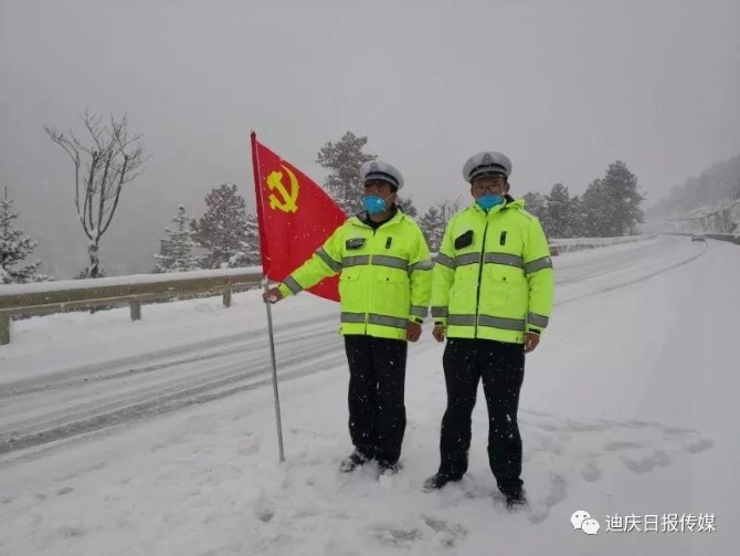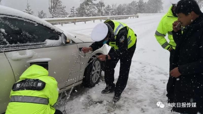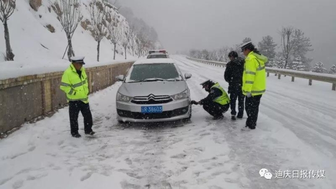 迪庆州公安局交警支队疫情防控应急处置突击队在国道214线香格里拉市次布腊卡垭口执勤巡逻,解救冰雪道路上被困车辆,确保道路交通安全畅通有序。