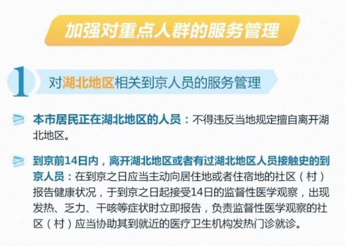 对于到京前14日内,离开湖北地区或者与湖北地区人员有接触的到京人员,到京后应在社区指导下,接受14日的监督性医学观察。
