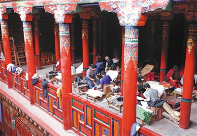 雕刻印版的工匠,向来是以师带徒的形式进行培养。所有工匠都要经过严格考核,只有那些技术完全熟练、做事一丝不苟的人,才能从事雕版工作。通常情况下,技艺娴熟的工匠每天只能完成一块印版的单面刻制,10天左右才能完成一幅画版的单面文字雕刻。比如,闻名全藏区的《甘珠尔》就是由100名书法家花了3年时间、500名工匠雕刻5年,才完成全书的印版刻制工作。正是有了这些精细的印版,许多重要的藏民族文化内容才流传下来。