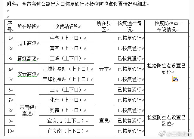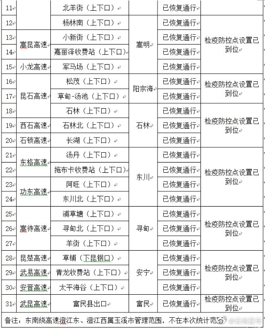 6686体育讯 机器人小明 2月10日,昆明市交通运输局根据《云南省应对疫情工作领导小组指挥部关于保障高速公路和国省干道交通顺畅的通知》,日前各县(市)区立即对未经云南省应对疫情工作领导小组指挥部批准关闭的高速公路出入口恢复通行,并在高速公路出口安排人员布设疫情防控点。截至2020年2月7日17:00,昆明市辖区内31个已封闭的高速公路出入口全部恢复通行。需要注意的是:由于属地政府疫情防控工作安排,部分高速公路收费站可能采取有针对性的管控措施,请广大车主朋友提前与需要通行的收费站属地政府联系了解管制情况,以免给大家的出行带来不便。(赵岗)