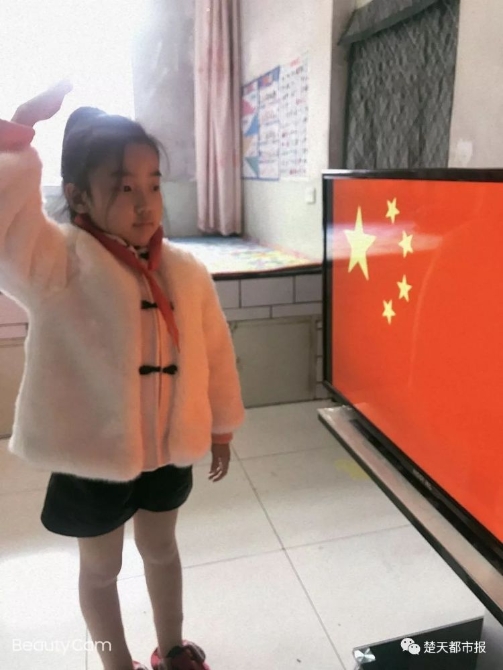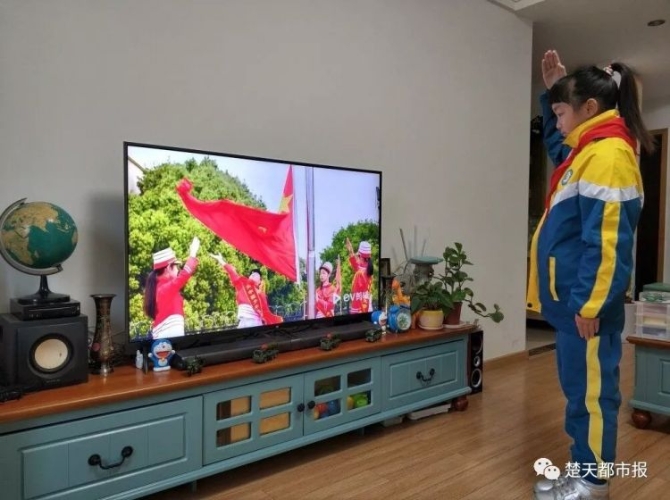 “全体立正,升国旗奏唱国歌!”今天上午8时许,武汉市江汉区武汉关小学三(1)班梁琳淼在家里参加开学典礼,她笔挺地站在电视屏幕前,胸口系着红领巾,朝电脑屏幕中的五星红旗敬礼。