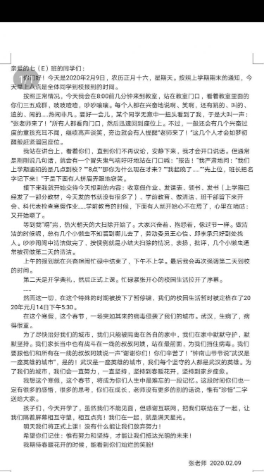 学生想上学,老师想学生。在武汉市第四十五中学,早上8:00,七(E)班班主任张晓霞在学生群和家长群发布了报到通知,并且附上了一封她给学生写的信。信件描述了如果此刻在学校,师生之间相处的种种细节:“某个同学无意中一扭头看到了我,于是大叫一声:‘张老师来了!’所有人都看向门口,然后迅速回到座位上。”“等到我‘嚼’完,热火朝天的大扫除开始了。大家兴奋着、抱怨着,像过节一样。” ……平凡、真实而细琐,读起来让人泪目:老师这是有多想念自己的学生!