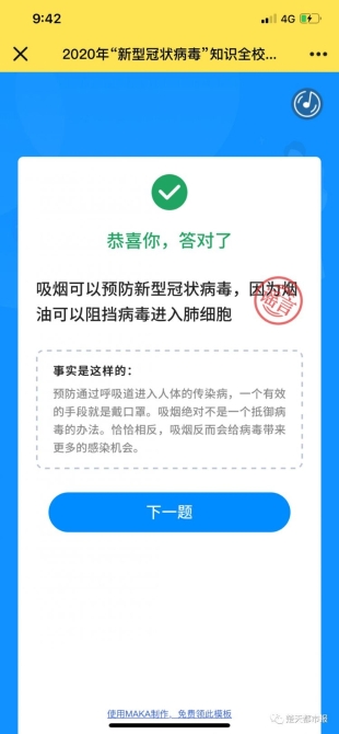 记者看到,这张试卷一共20道判断题,总分100分,题目有勤洗手和戴口罩可以降低新型冠状病毒感染风险,是真的吗?白醋放在暖气片可以消毒室内空气,是真的吗?学生每做完一道题,都会当即出现试题结果以及相关的详细解释。20个题做完后,还会在线出现考试分数。楚才小学校长吴颖静介绍,这些题目是老师们在网上进行新闻和科普知识收集后,进行出题,师生们还可以直接将这份网络试卷推送给家人参与“考试”。