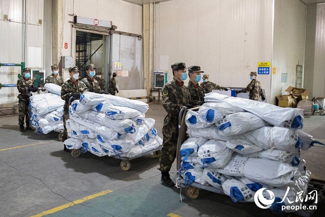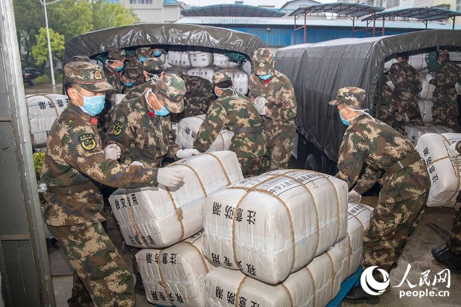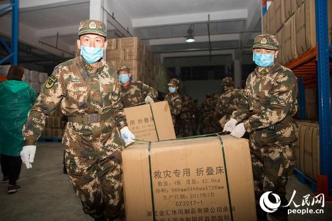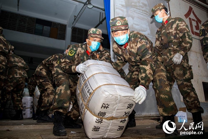 2月9日,武警官兵正在搬运救援物资。123456来源:人民网-军事频道 2020年02月11日11:20