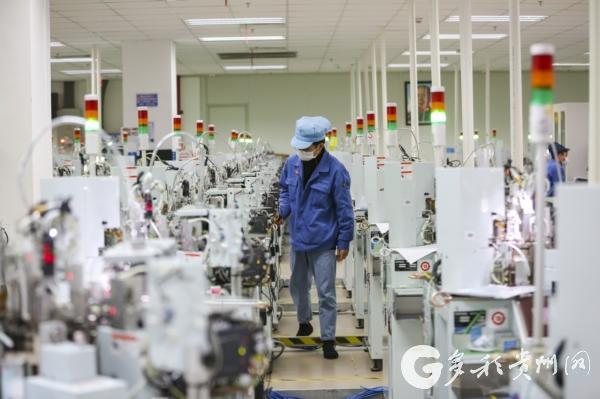 贵阳顺络迅达复工复产,工人戴着口罩在生产线上巡查(贵阳日报 石照昌 摄)