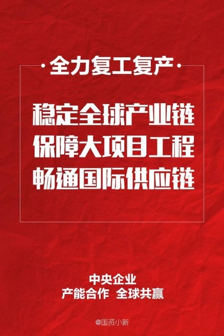 国务院国资委党委深入学习贯彻习近平总书记重要指示批示精神,坚决贯彻落实党中央、国务院决策部署,落实中央应对新型冠状病毒感染肺炎疫情工作领导小组要求,指导中央企业一手抓疫情防控,一手抓复工复产,全力以赴保持生产经营稳定运行,努力为打赢疫情防控阻击战作出国资央企积极贡献。有关中央企业全力推进复工复产,稳定外需,加强国际产能合作,加快海外重点工程建设,促进全球产业链稳定、供应链畅通。