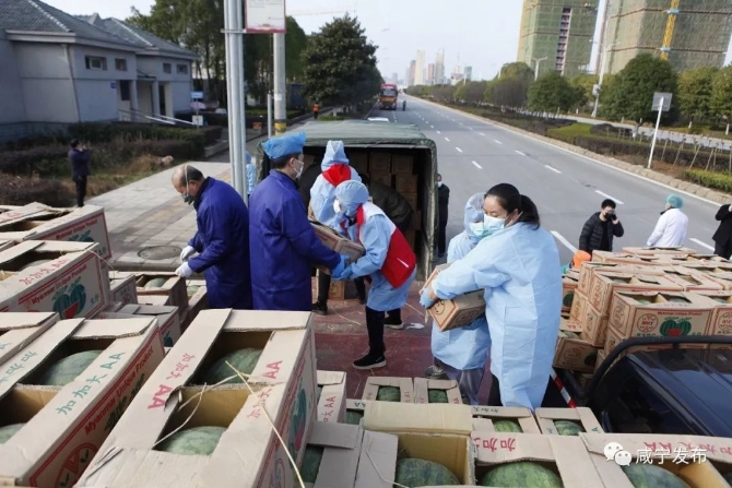 现场守候多时的几十名咸宁义工,当即开始转运爱心西瓜。