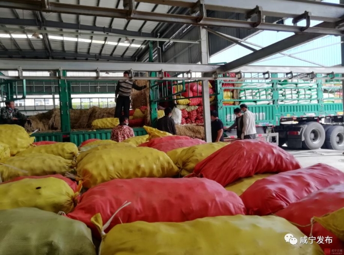 14日中午12点半,两大卡车52吨土豆,12吨大米从云南盈江县出发,经过2000多公里跋涉,从咸宁北下高速抵达咸安区亿丰农商贸大市场。