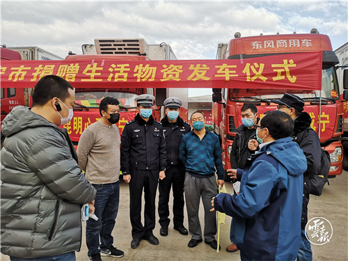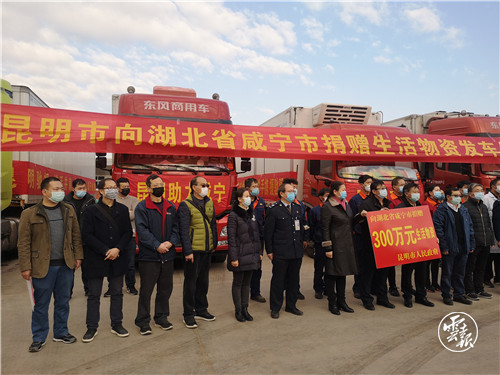 疫情紧急,咸宁人民处于危难之中。按照昆明市委市政府的安排,这批临时组建的物资运送组一行13人,6辆大车,满载价值300万元的生活物资,一路向东,直奔咸宁。