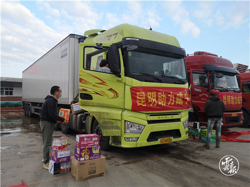 9点30份,车身上贴着“昆明助力咸宁”“昆明驰援 携手并肩 抗击疫情 咸宁必胜”大字的冷链货车缓缓驶出。出发后,他们将星夜兼程,预计三十个小时到达咸宁。