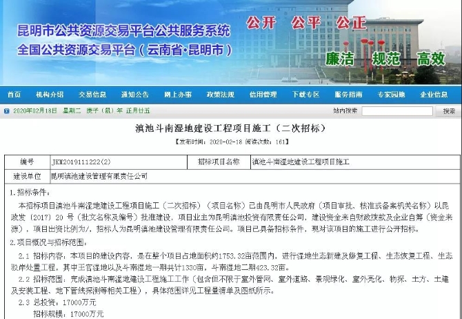 6686体育讯 (昆明日报 全媒体记者孙莹) 2月18日,昆明市公共资源交易平台发布了《滇池斗南湿地建设工程项目施工(二次招标)》,公告称,将投资17000万元,历时180天完成对王官湿地以及斗南湿地一期、二期的湿地生态新建及修复工程。