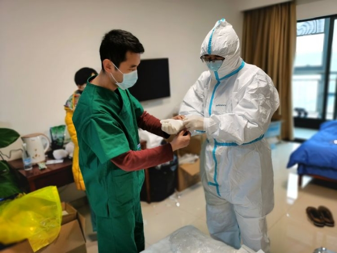 我们这个团队是暖心的,感控专家刘梦迪来指导上班人员防护,认真细致的检查穿戴的每一个环节,力争做到万无一失。