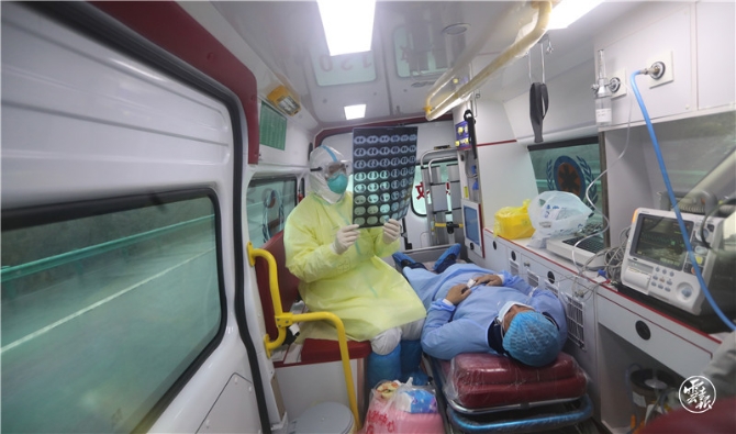 一路上,李波一直在急救车负压舱中守护患者,和他进行零距离交流,并抓紧时间查看患者的CT片和病历。