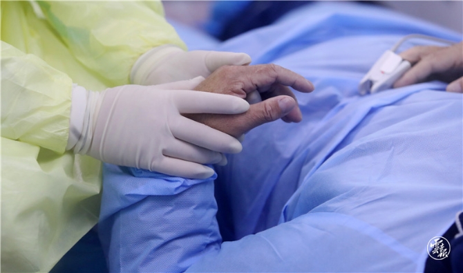 李波不时握着患者的手进行安抚,并用自己握紧的拳头为他加油鼓劲。
