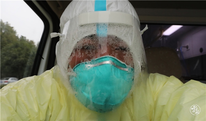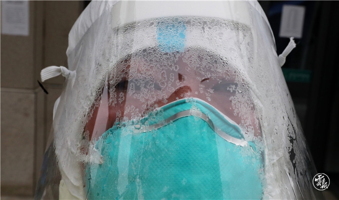 由于防护服高度密封,感觉身体温度不断升高,呼吸困难,非常难受。防护面罩上全是汗水,视线模糊,后期几乎是在盲拍。可以想象,在重症室中紧张工作的医务人员,将面临怎样的工作强度和难度——他们不仅要全力投入救治,还需要有极大的忍耐力。这样的体验让我终身难忘。