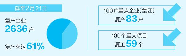 复工复产工作启动以来,云南省实行“一企一策”,强化协调服务,帮助企业解决复工复产的实际困难和问题。截至2月21日,全省规模以上工业企业已复产2636户,复产率达61%,复工人员38.18万人。省工信厅跟踪的“两个一百”企业和项目中,100户重点企业(集团)已复产83户,复产率83%;100个重大项目已复工59个,复工率59%。