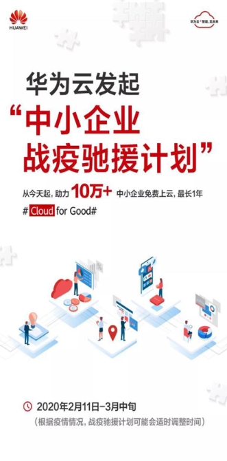 响应国家复工复产号召,华为、百度、阿里等许多在线办公平台及云服务厂商陆续宣布免费开放数字化办公产品。1月25日,华为云宣布在疫情期间向社会各行业免费开放智能工作平台WeLink。华为云还发布了“中小企业战疫驰援计划”,面向受到疫情影响的中小企业免费开放战疫云资源包。百度发起“共度计划”,通过免费开放AI技术、帮助传统企业线上转型、全方位营销赋能等系列措施,为中小企业提供新环境下的转型助力。