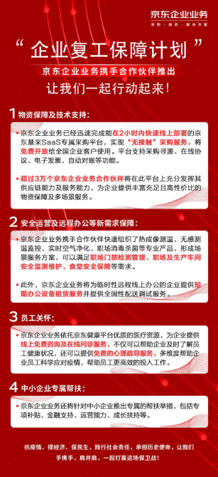 如何安全复工并恢复有序生产运营?面对这一大考,京东发起“企业复工保障计划”,提供一揽子支持。京东免费开放慧采SaaS专属采购平台,推出复工复产安全场景解决方案,京东数科通过科技能力为企业用户提供优惠利率、延期还款、重组展期等服务。从生产物资快速寻源、在线协同等数字化技术支持到中小微企业专项帮扶,京东打响了一场“复工保卫战”。