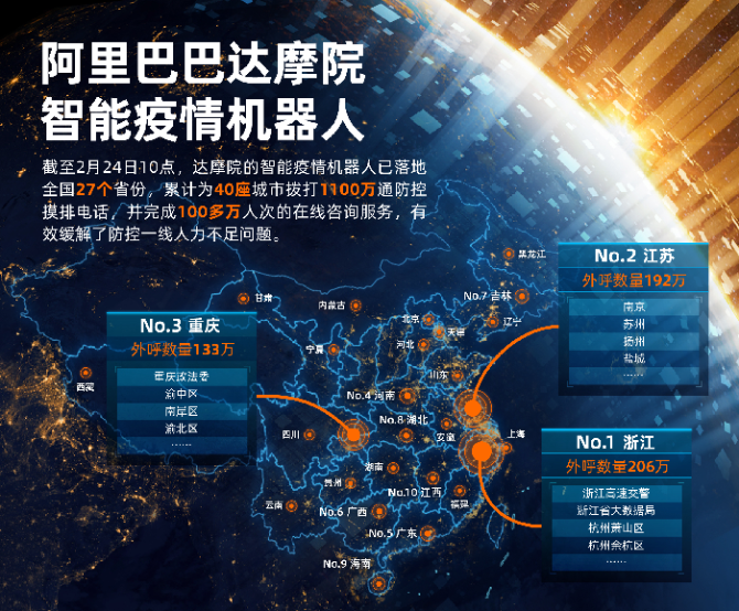 在经历了5天彻夜研发之后,达摩院于1月27日推出智能疫情机器人,率先落地浙江、黑龙江和山东济南三地。随着疫情防控阻击战的深入,各地在开展地毯式调研排摸、医学跟踪外呼等工作时,纷纷遭遇人力不足的困难。挨家挨户上门沟通的方式不仅效率低下,还会加大接触性感染风险。