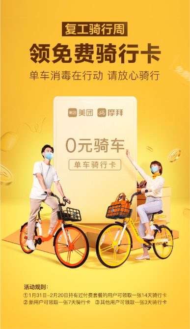 1月31日至2月22日期间,持有过美团单车骑行套餐的用户,即日起均可在美团App或摩拜单车App免费领取1张14天骑行卡,赠送天数会累计到用户的剩余持卡天数里。新用户注册可立即免费领取1张7天骑行卡,非付费骑行套餐的用户也可免费领取1张3天骑行卡。