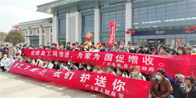 2月13日上午,23名回昭通过节的浙江罗纳服饰有限公司员工,由政府工作人员和医务人员护送,搭乘返岗专车回厂上班,成为昭通市新冠肺炎疫情防控期间云南首批集中返岗的务工人员。昭通市采取家门、车门、厂门“三门相连”,全力帮助有意愿外出的劳动力及早返岗复工和实现就业增收。从2月13日首班返岗专车开始,截至2月23日,共组织包机一架次、高铁专列2趟、专车197辆,共输出147批次24748人,名列全省前列。