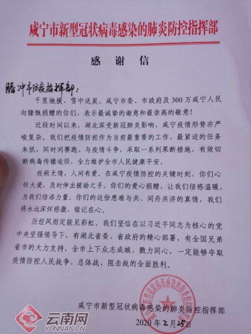 “千里驰援、雪中送炭”,“疫病无情,人间有爱”!接收到捐赠物资后,咸宁市委、市政府代表300万咸宁人民向腾冲市新冠肺炎疫情应急指挥部发感谢信,向腾冲人民表示最诚挚的谢意。