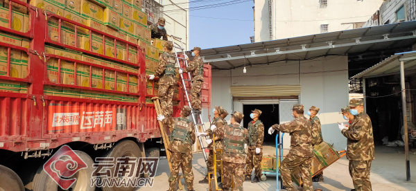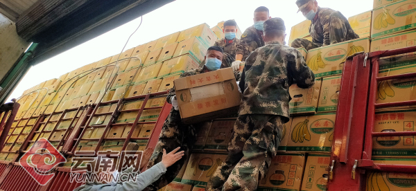 52名咸宁市武警和消防官兵帮忙对咸宝水果市场安置的7车香蕉进行卸货,从早上开始,官兵们用肩扛、用手抬,把一件件沉甸甸的香蕉从货车上搬下来,搬进仓库妥善地摆放起来。大家满是汗水也不休息一下,“腾冲人民大老远地给我们送物资,这份心意让我们很感动,我们也想赶紧把车卸完,让这些腾冲兄弟们早回家。”