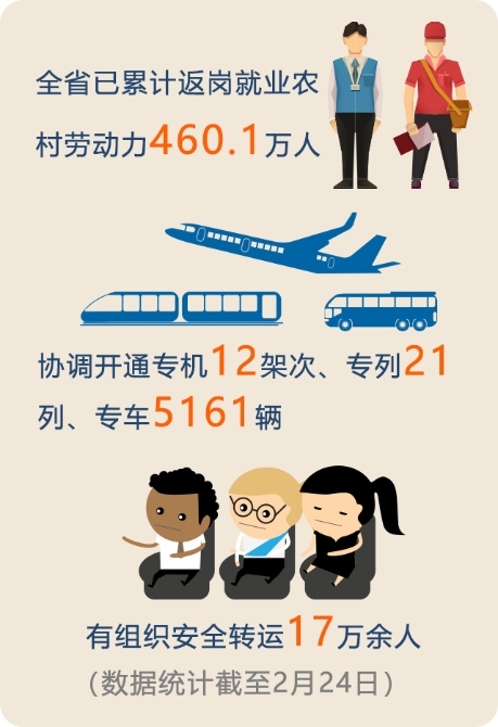 截至2月24日,云南全省已累计返岗就业农村劳动力460.1万人;协调开通专机12架次、专列21列、专车5161辆,有组织安全转运17万余人。