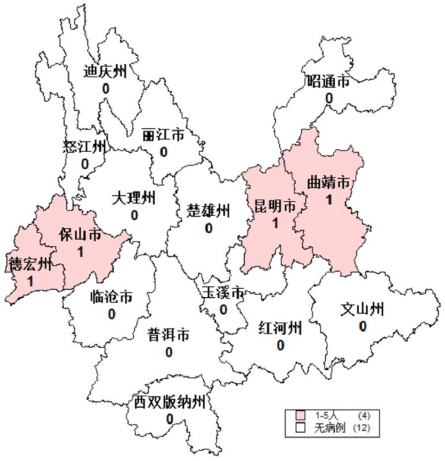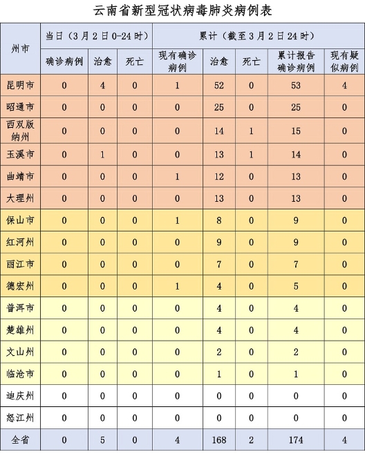 各州市累计确诊病例:昆明市53例(治愈出院52例),昭通市25例(治愈出院25例),西双版纳州15例(治愈出院14例、死亡1例),玉溪市14例(治愈出院13例、死亡1例),曲靖市13例(治愈出院12例),大理州13例(治愈出院13例),保山市9例(治愈出院8例),红河州9例(治愈出院9例),丽江市7例(治愈出院7例),德宏州5例(治愈出院4例),普洱市4例(治愈出院4例),楚雄州4例(治愈出院4例),文山州2例(治愈出院2例),临沧市1例(治愈出院1例)。