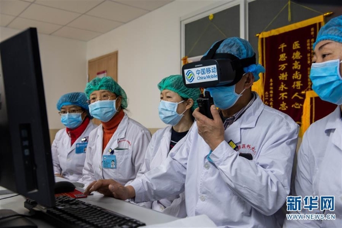 2月26日,医务人员使用VR设备查房。 新华社记者 胡超 摄