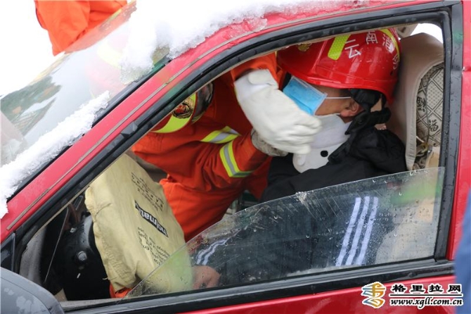 演练假设:2月27日上午11时00分,迪庆消防救援支队指挥中心接到报警称:箐口方向工业园区旁一辆皮卡车与一辆私家车相撞,有一人被困。迪庆消防救援支队指挥中心立即调动仁安路特勤站4车20人赶往处置。