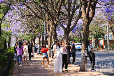 每年四五月份,蓝花楹绚烂盛放,蓝紫花海的昆明教场中路成为网红打卡点。3月9日,记者从五华区教场中路市容环境整治提升新闻通报会获悉,作为全区30条列入提升范围的道路之一,也是全国知名的“网红”蓝花楹大道,教场中路将通过补种、移栽500余株蓝花楹树,新建4个主题广场等进行提升。这也是全区首条开工的重点整治提升改造道路。