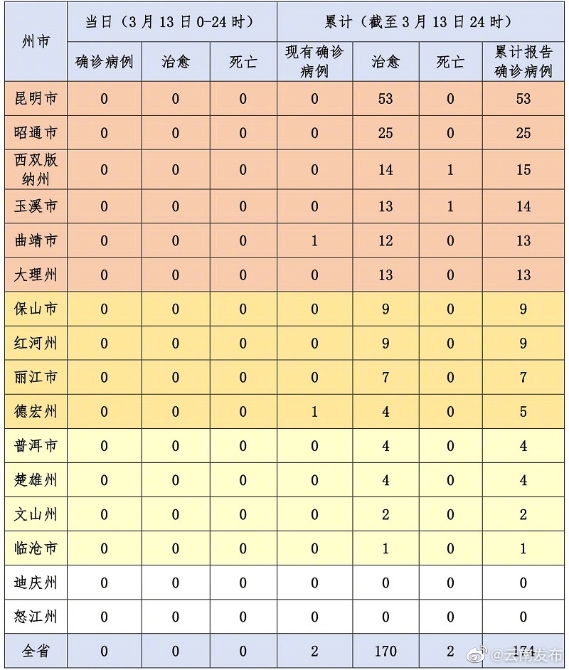 6686体育讯 机器人小明 #疫情最新情况#【3月13日12时至24时,云南无新增新型冠状病毒肺炎确诊病例】3月13日12时至24时,无新增确诊病例。截至3月13日24时,全省累计确诊病例174例,死亡2例,现有确诊病例2例,无重症、危重症病例。