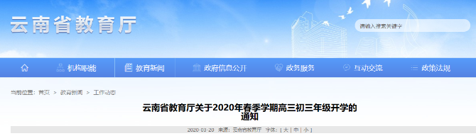 3月20日,记者从云南省教育厅网站获悉,云南省教育厅今日发布《关于2020年春季学期高三初三年级开学的通知》(以下简称《通知》),对初三高三年级开学时间、报到及校园防控工作做出具体要求。