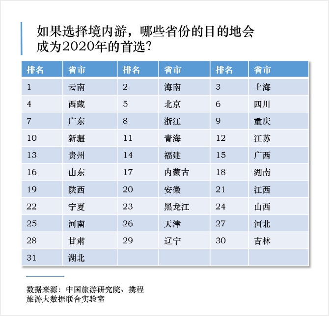 国内游哪些地方会成为2020年出游的热门目的地?从问卷数据看,此前的热门目的地省市依然保持高人气,根据投票比例,排名前十名的是:云南、海南、上海、西藏、北京、四川、广东、浙江、重庆、新疆。其中,云南、海南、上海分别以17%、15%、14%的票数位居前三。