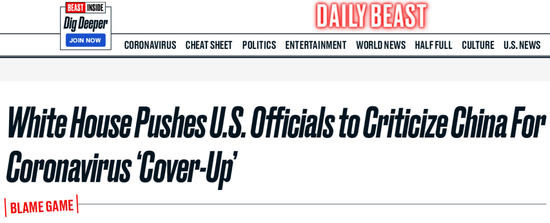“我们被要求尽快用各种方式把这种声音传播出去……一切都和中国有关!”21日,美国《每日野兽》援引两名白宫匿名官员爆料以及白宫的一份政府电报的内容称,特朗普政府正要求联邦政府官员在对外谈话中都要指责中国“掩盖疫情”,强调中国官员“负有特殊责任”。