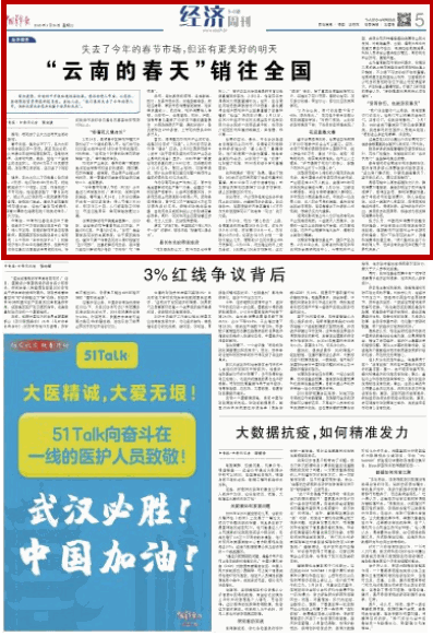 3月24日出版的《中国青年报》5版刊发文章《失去了今年的春节市场,但还有更美好的明天 “云南的春天”销往全国》。对云南鲜花市场在经历了千万枝玫瑰烂在田中的“惨淡”情人节之后,区长、县长、市长如何通过网络爱心助农活动带领花农度过“寒冬”进行了报道。