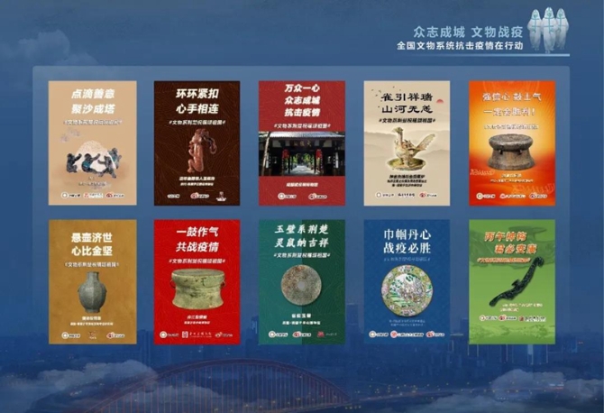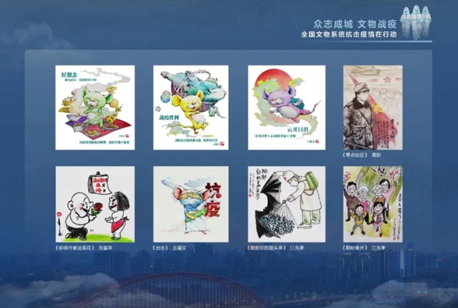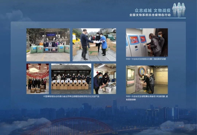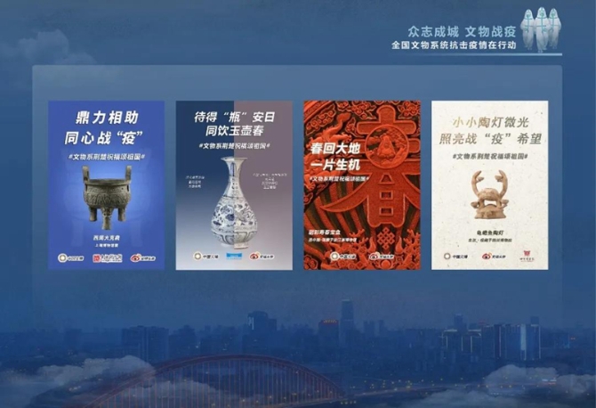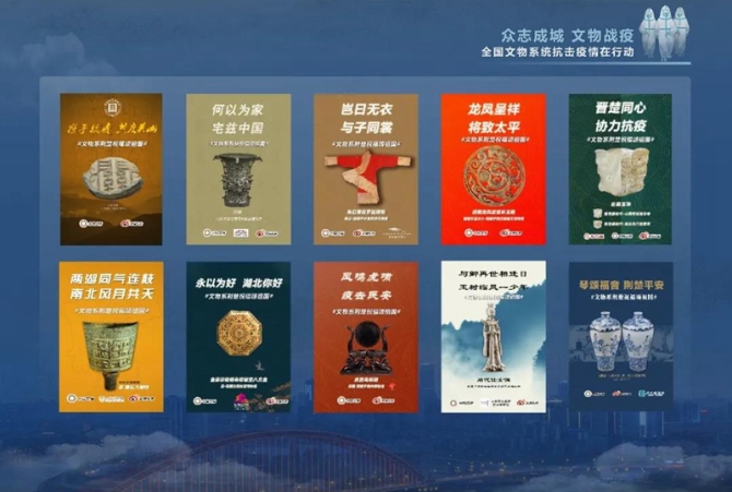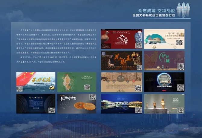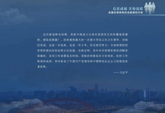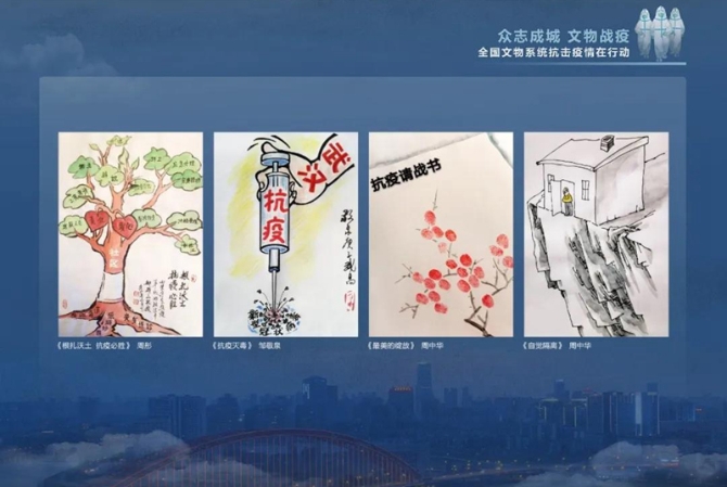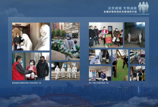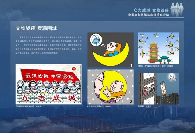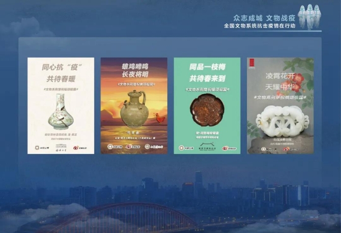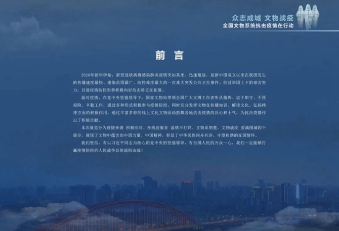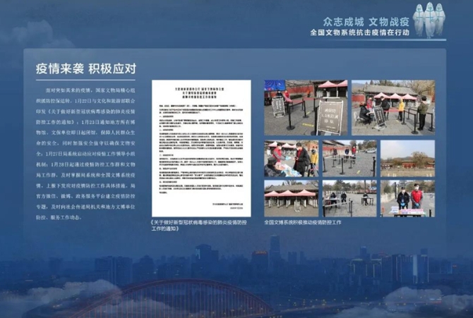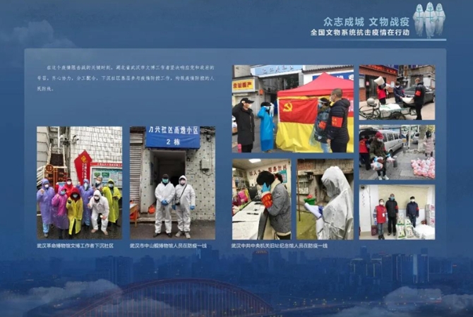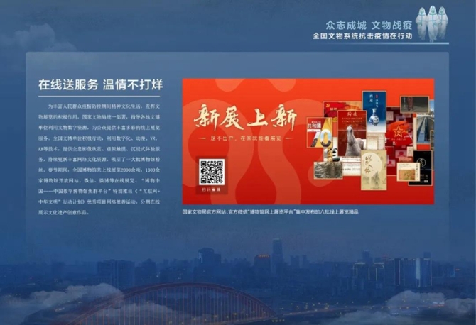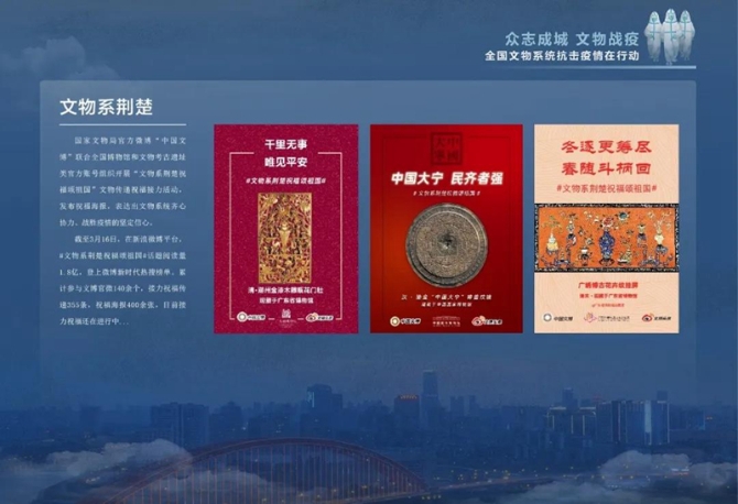 闭馆不闭展、温情不打烊、文物系荆楚、祝福颂祖国……回望文物系统在疫情防控阻击战中的作为与担当,点点滴滴,汇聚成“众志成城文物战疫——全国文物系统抗击疫情在行动”展览。